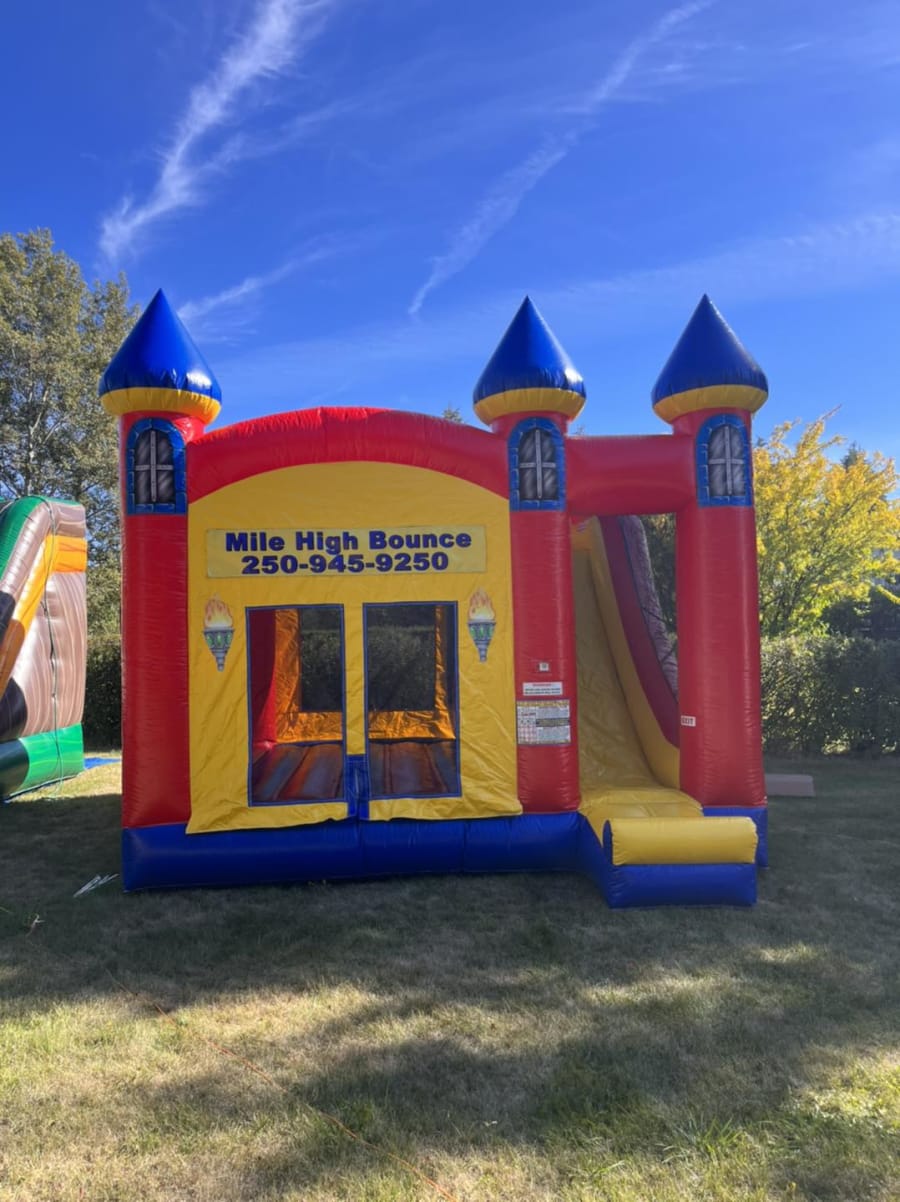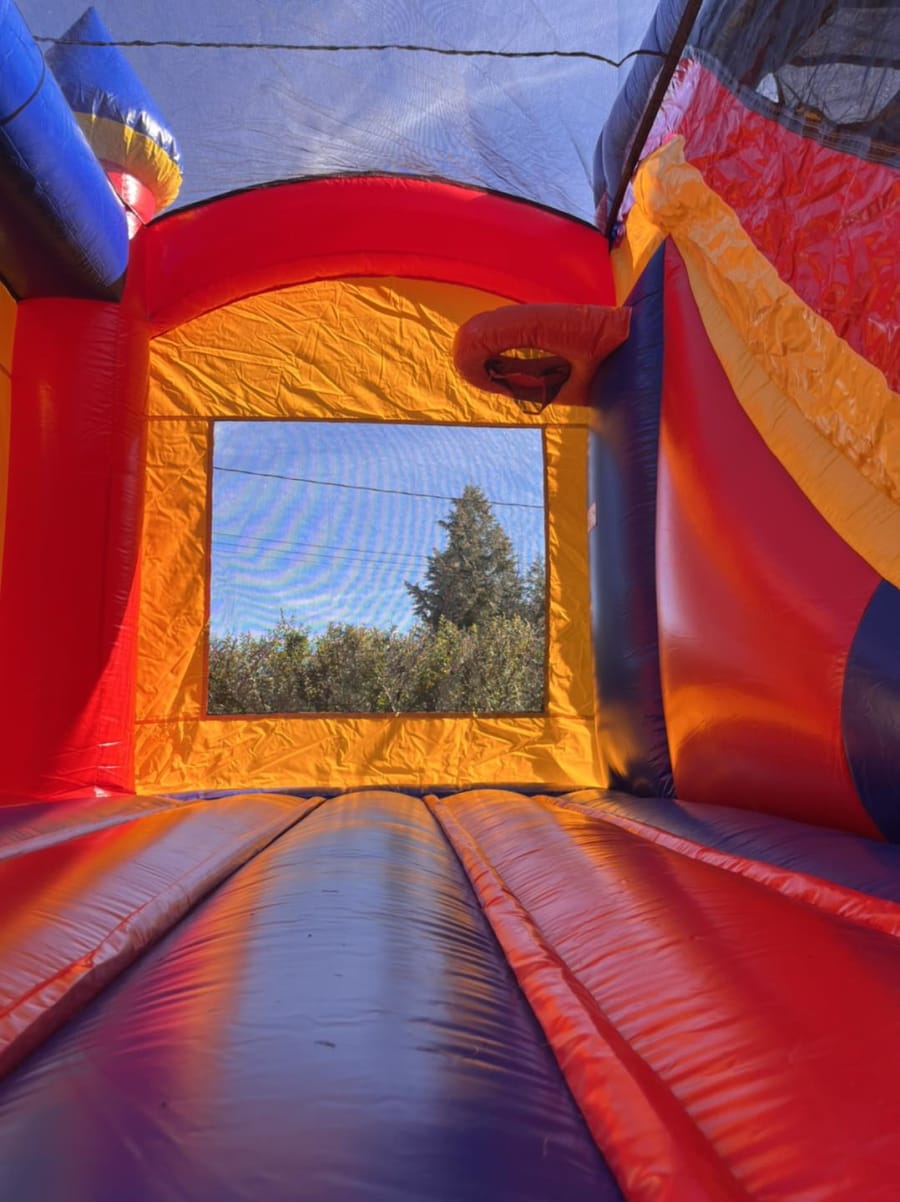 Our 4 in 1 Excalibur Castle Combo is our most popular unit! Always a party pleaser, it features a bouncer, basketball hoop, climbing ladder, and slide with a 140 square foot bouncing area. The top and side of the slide is completely enclosed in a sun-screened mesh cage, making it very safe and sturdy for the kids to climb up and slide down again and again!