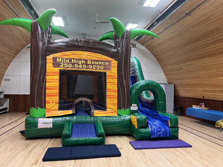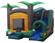 Paradise Palms has a 10x10 bouncing area with ball hoop inside, and an attached slide! Kid-friendly netting and a fully contained platform allows parents to kick back and relax while the kids go bananas! This particular unit has non-slip vinyl and can be used as a Waterslide!