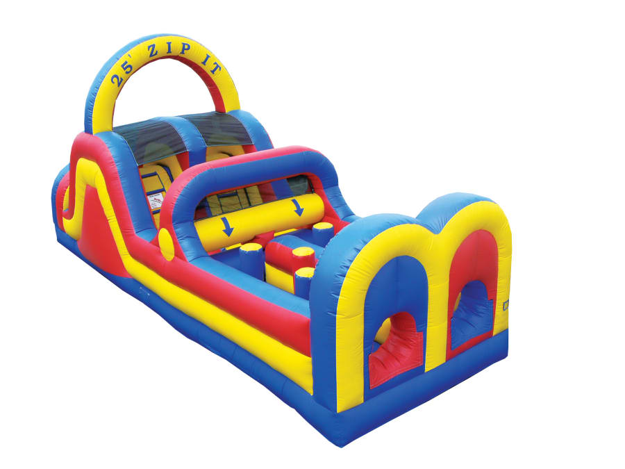 Our 25' Zip It Obstacle Course can be used dry as well, of course! Remove the detachable pool and this unit is great for indoor play all year round.